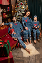 Dizajnirana za praznike: Denim plavi gornji deo s motivom irvasa u centru i karirane pantalone stvaraju jedinstven i prepoznatljiv praznični stil.