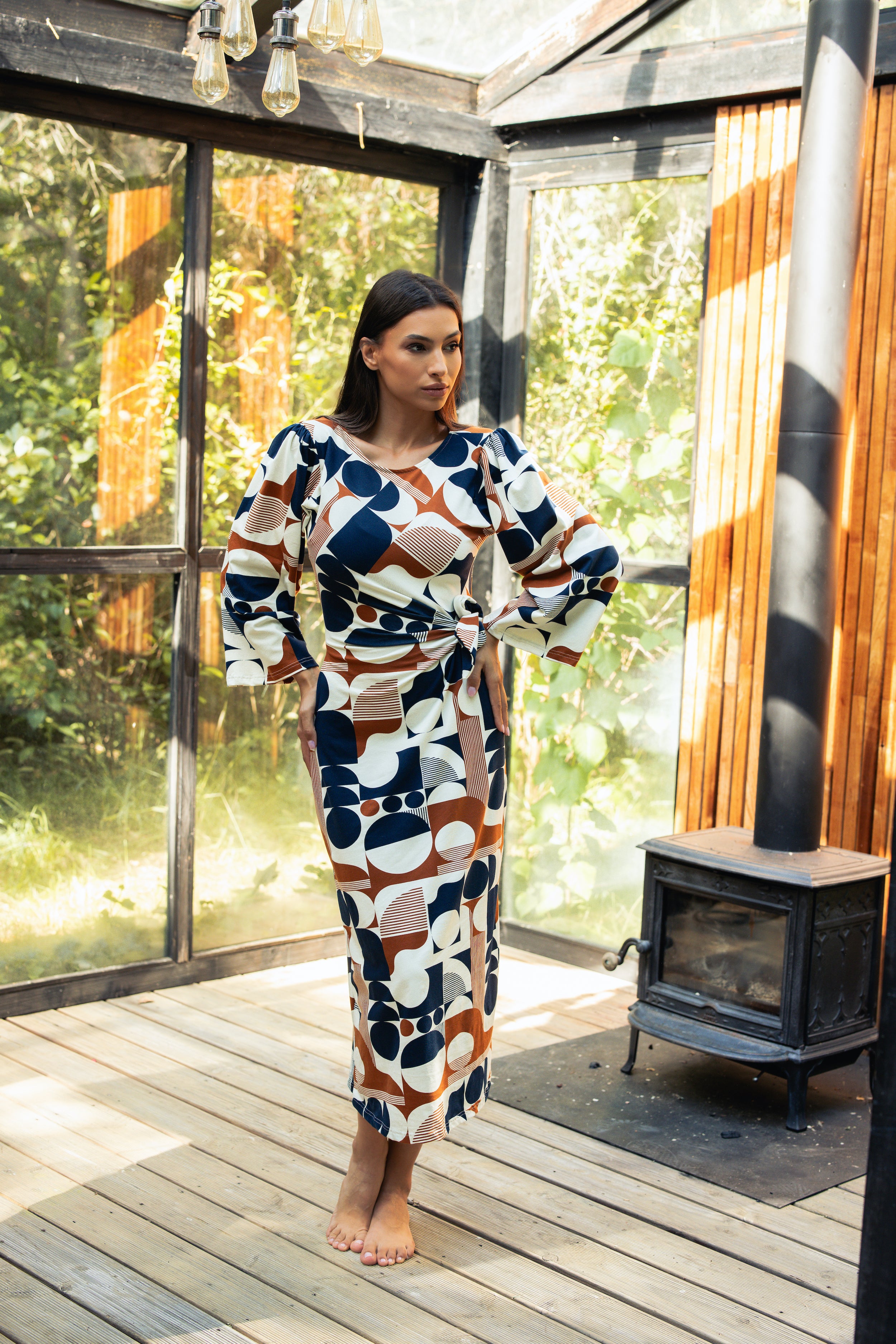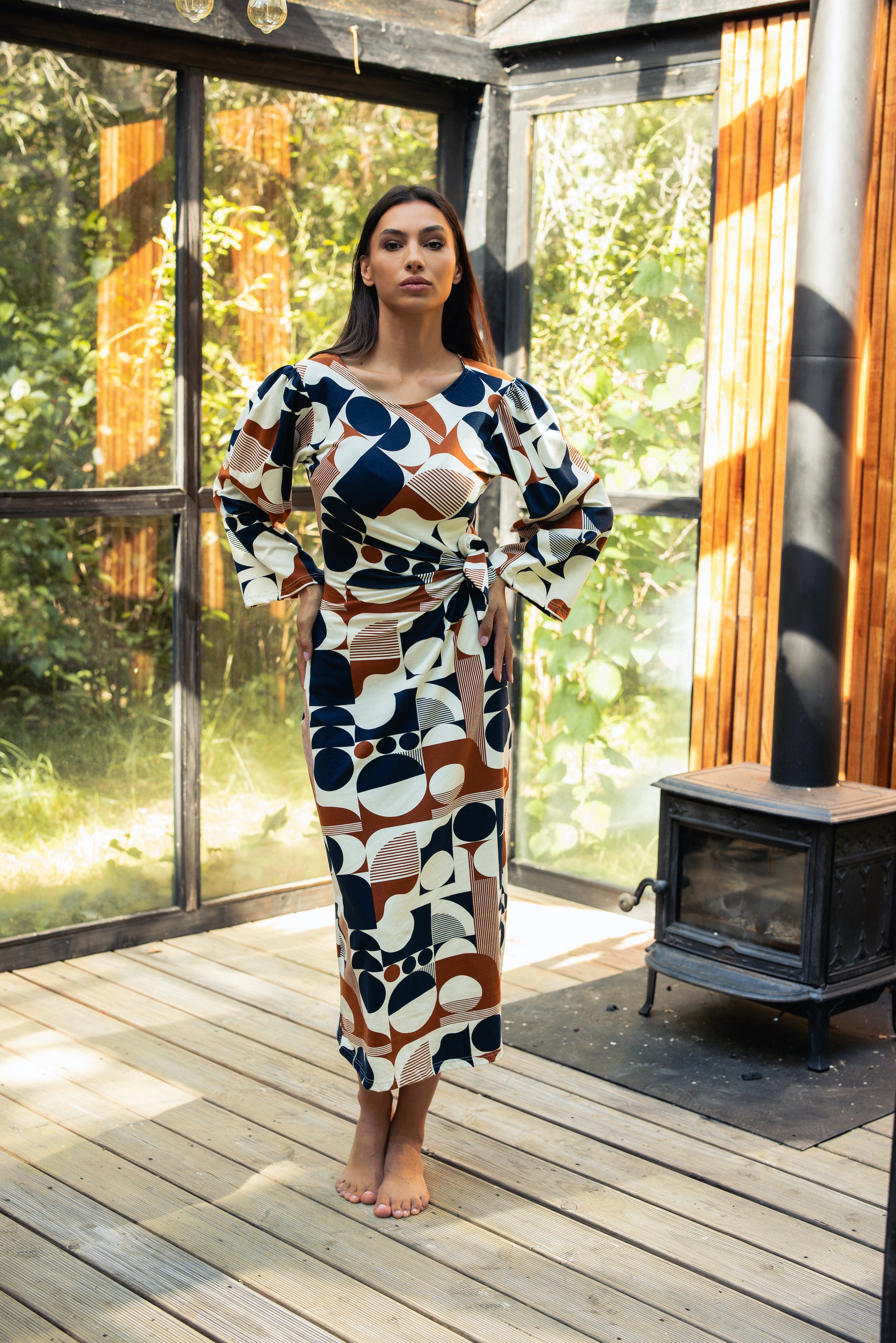 • Grafički, retro–geometrijski print u tonovima tamnoplave, karamele i bež — lako se uklapa sa neutralima.