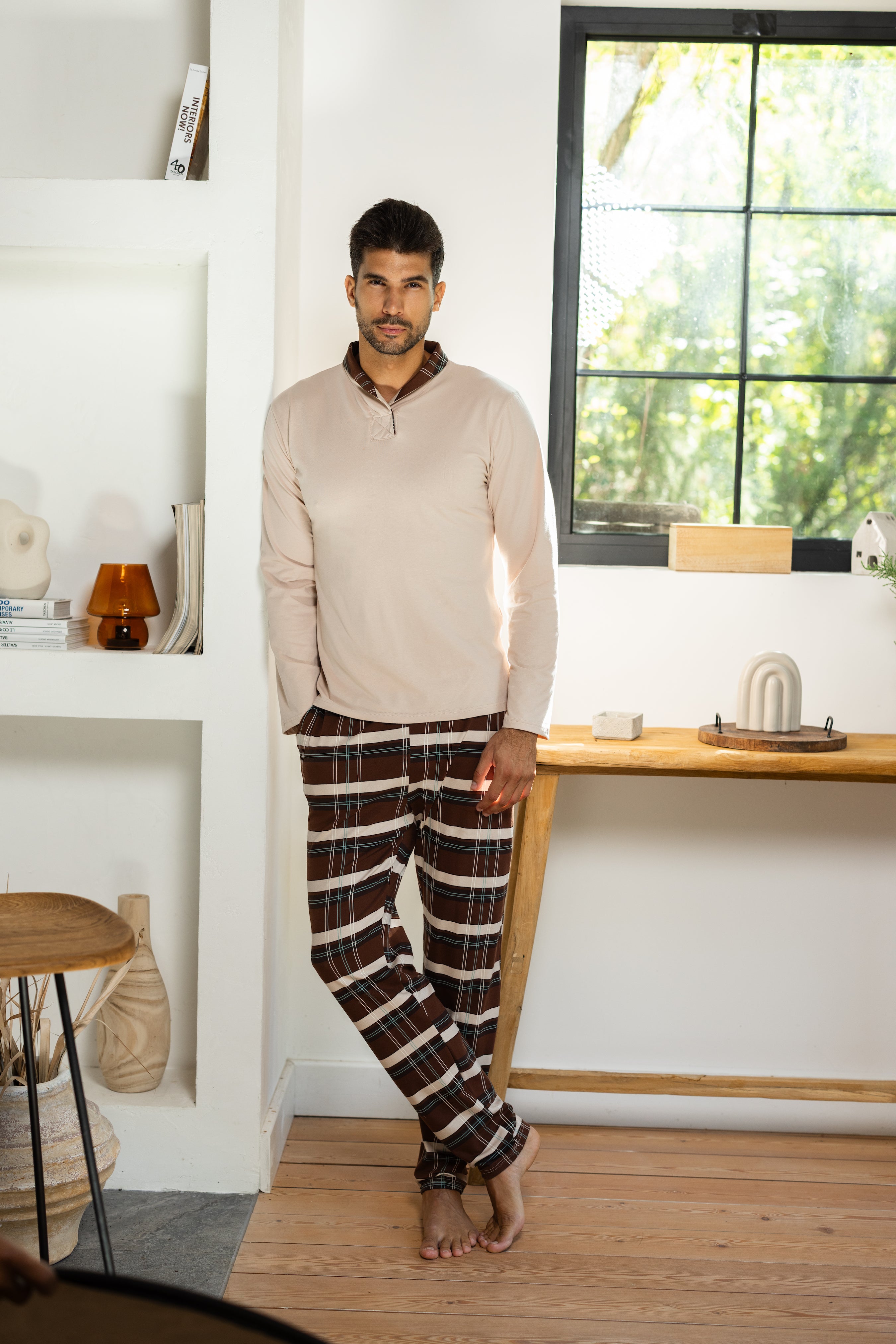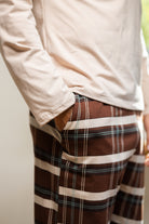 Donji deo: pantalone sa klasičnim krojem u kariranom uzorku u smeđim i bež tonovima, idealne za sofisticiran stil i opuštenost.