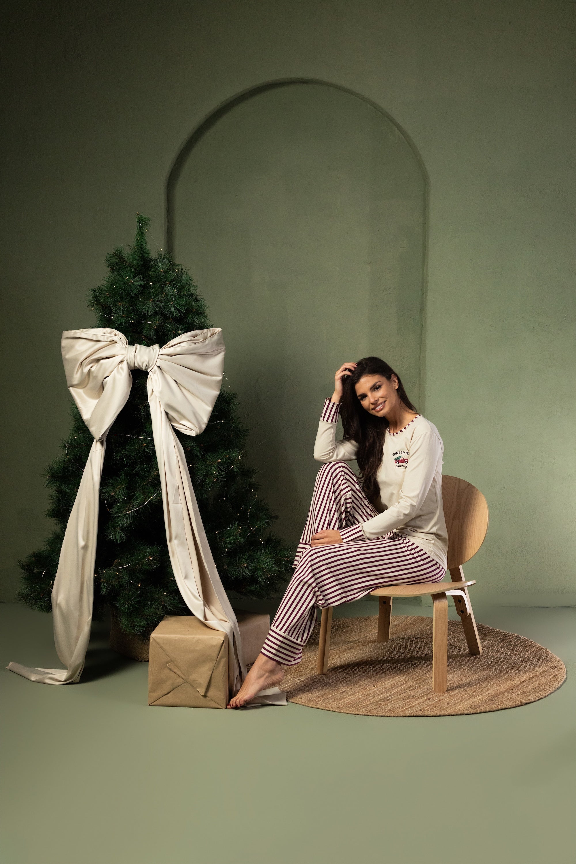 Bordo-burgundi pruge na pantalonama dodaju elegantan, ženstven praznični ton.