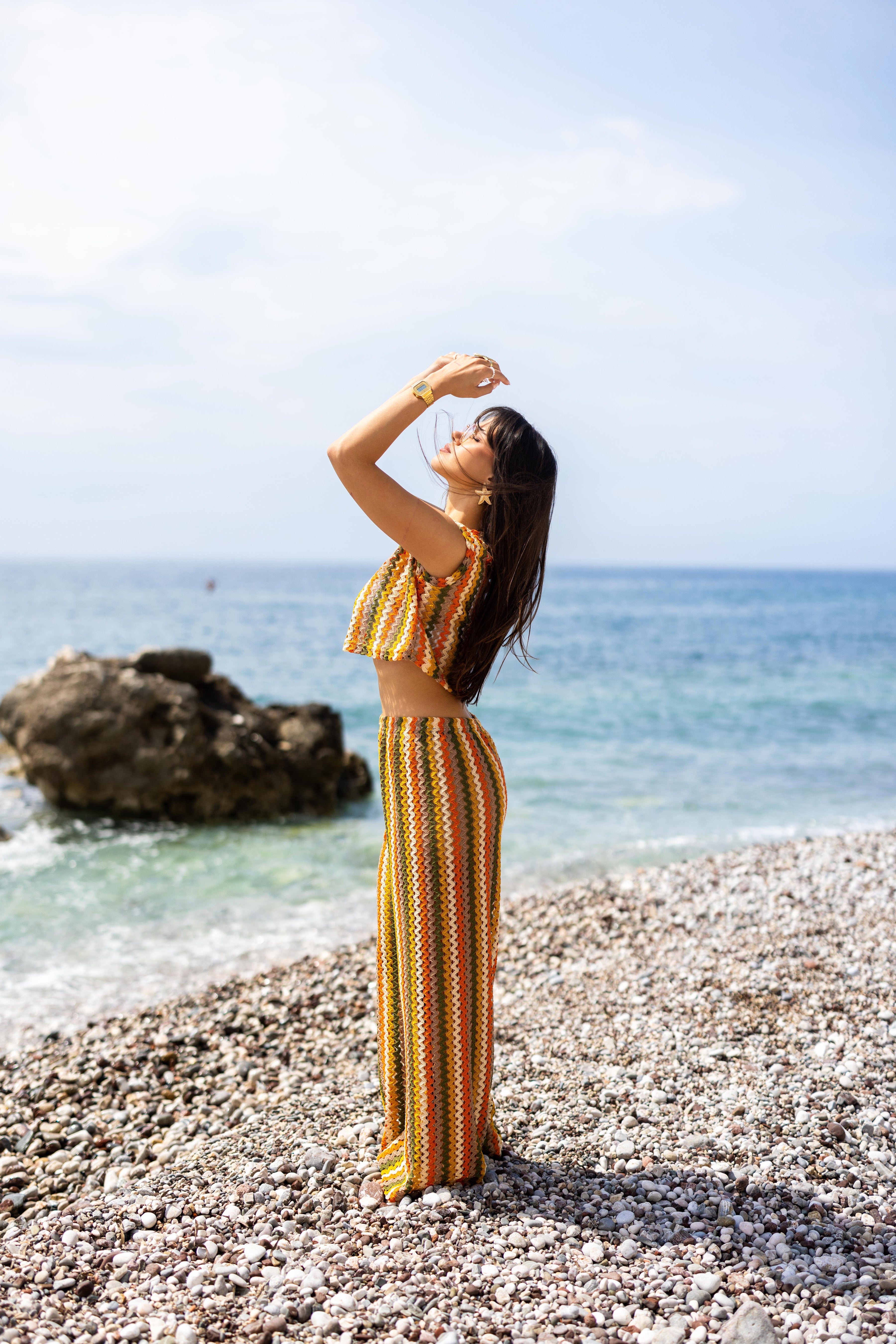 Lagani letnji top koji diše sa tobom. Upečatljiv zig-zag dezen i prozračna tekstura ga čine savršenim izborom za plažu i šetnje pored mora.