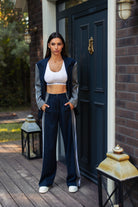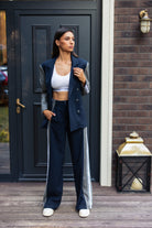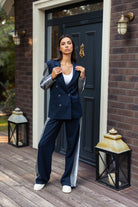 • Sakoi sa sportskim linijama i široke pantalone stvaraju upečatljiv kontrast koji odiše samopouzdanjem.