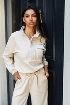 Donji deo: Pantalone ravnog kroja sa elastičnim pojasom i učkurom za savršeno podešavanje.