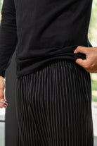 Donji deo: crne pantalone sa tankim prugama za modernu notu